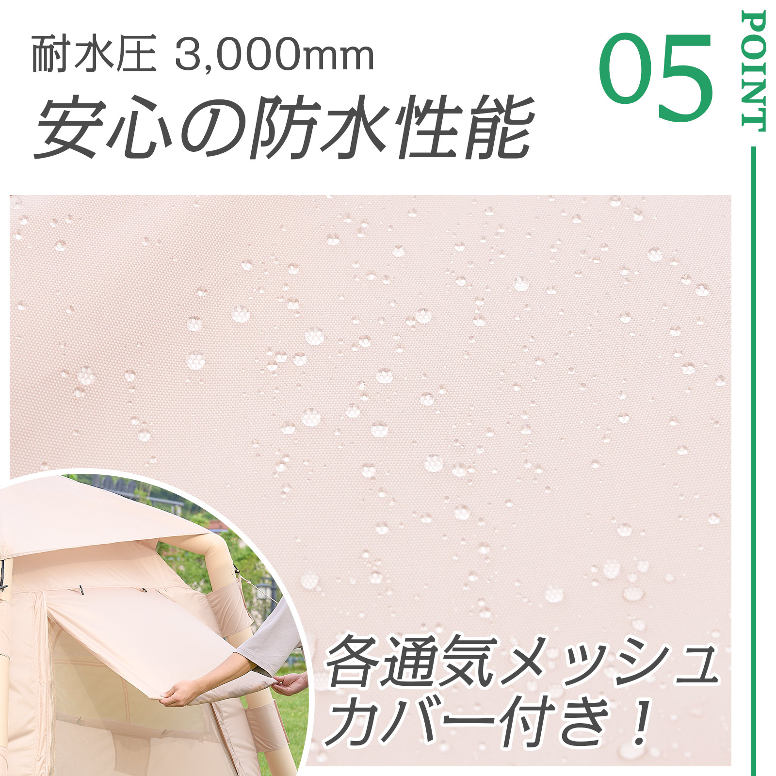 メッシュカバー付きで虫を防ぎ、防水仕様で雨の日も安心。