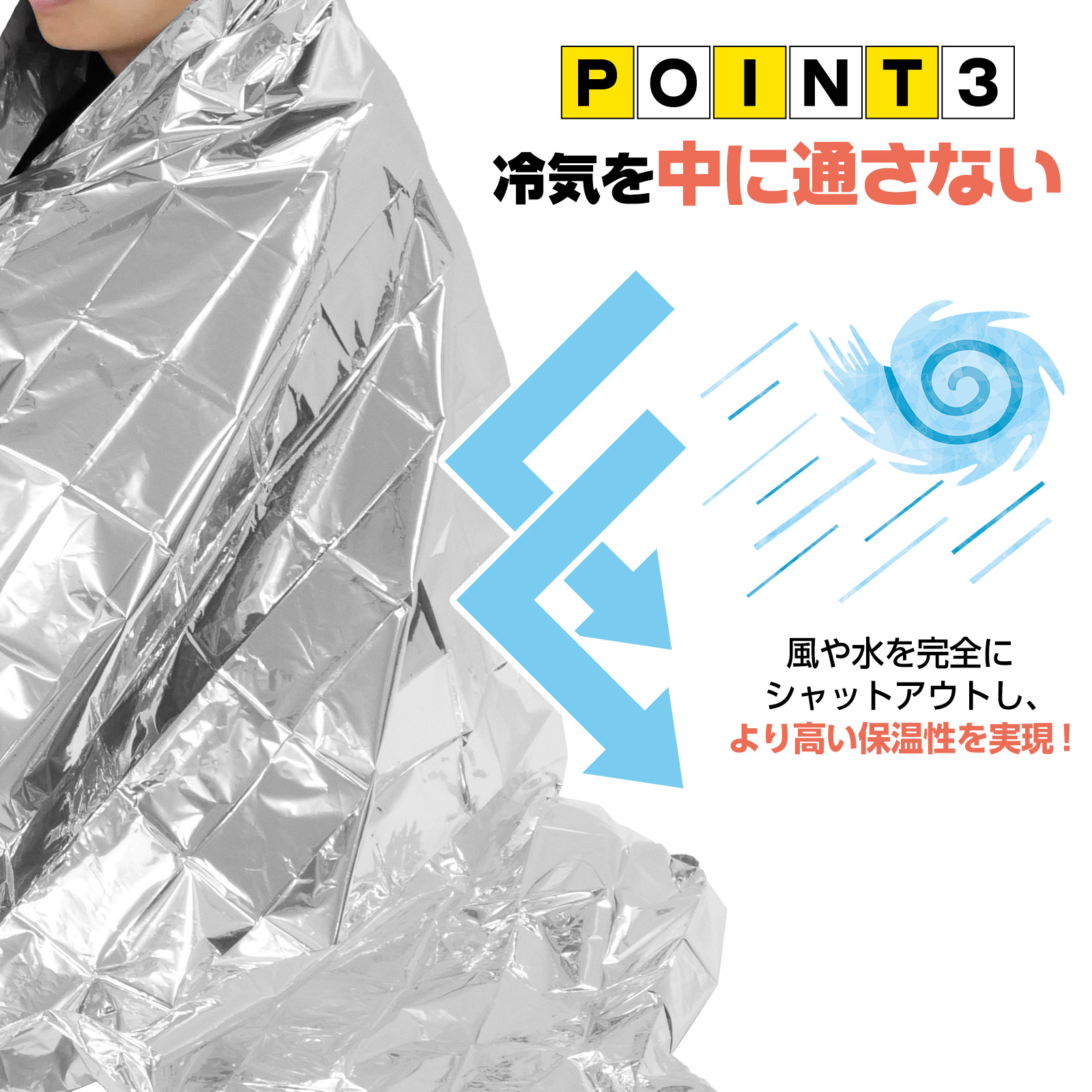 外からの冷気を防ぎ、避難所や野外で役立ちます。