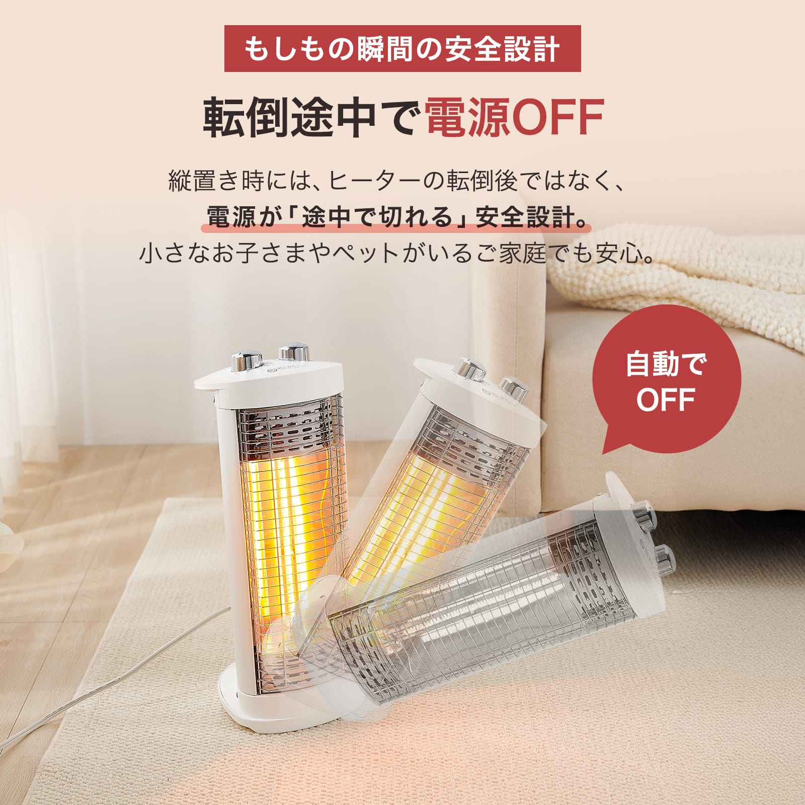 転倒時は自動で電源が切れる安心設計で、小さなお子さまやペットがいるご家庭でも安心。