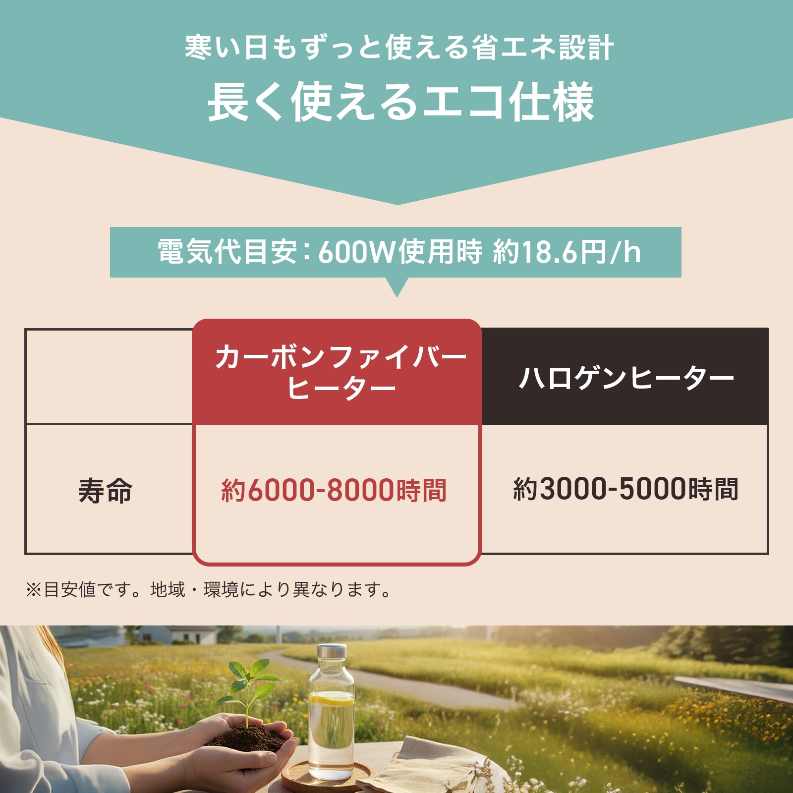 カーボンファイバー管がすばやく発熱し、身体の内側からじんわり暖めます。