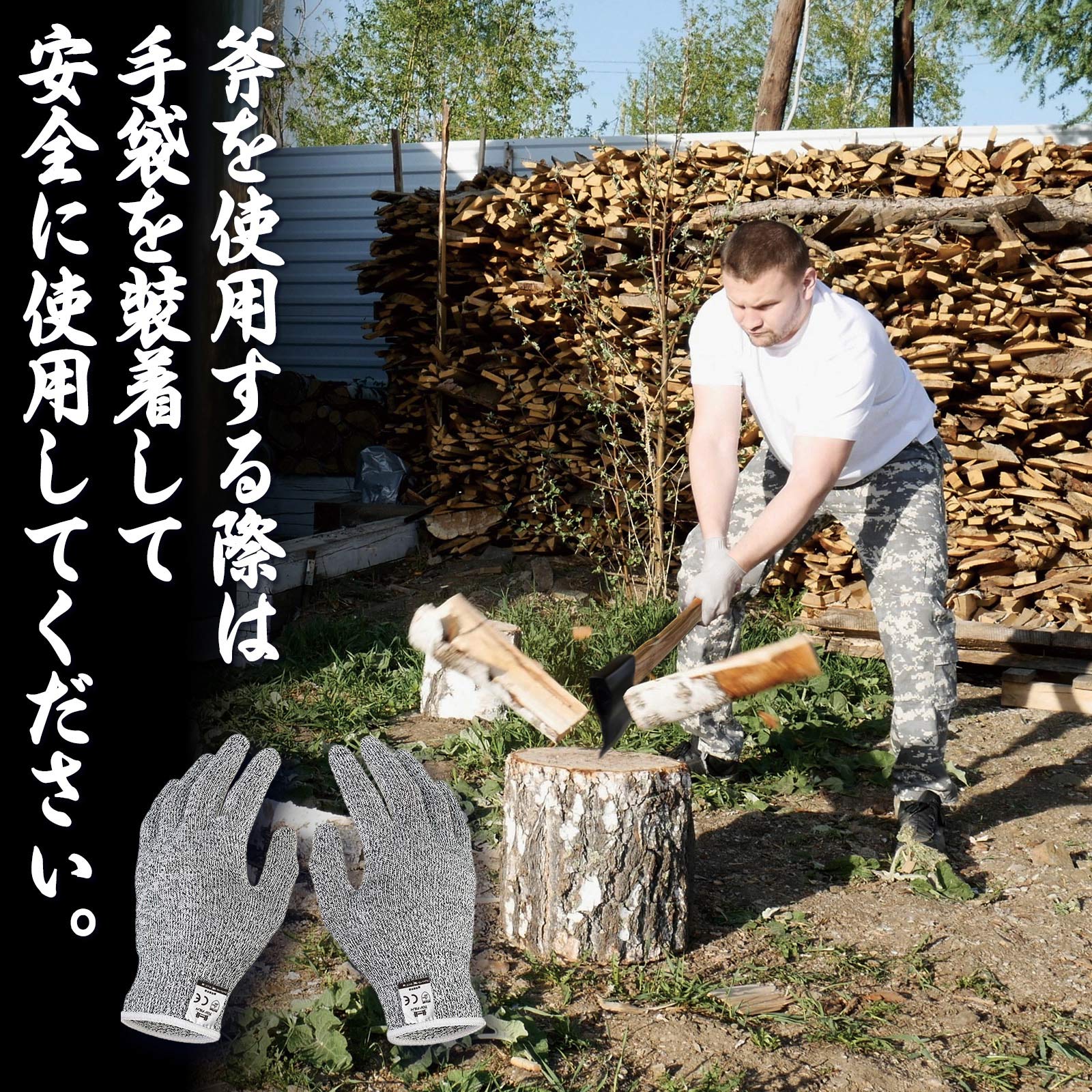 専用刃保護用ゴムカバーと斧ヘッド用PU保護カバーと耐切創5級手袋付き。