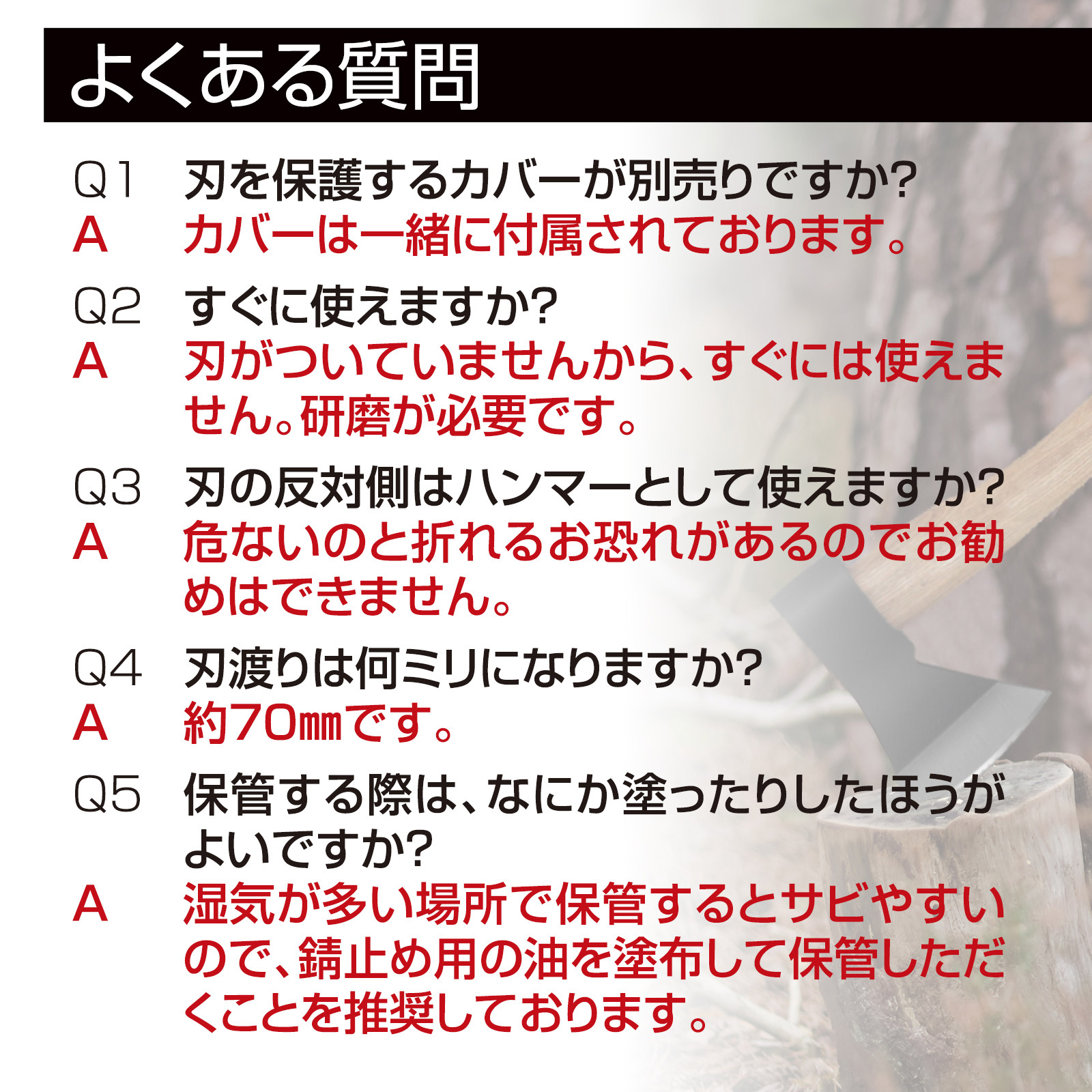 購入後はすぐに使用せず、斧を使う前に必ず研磨してください。