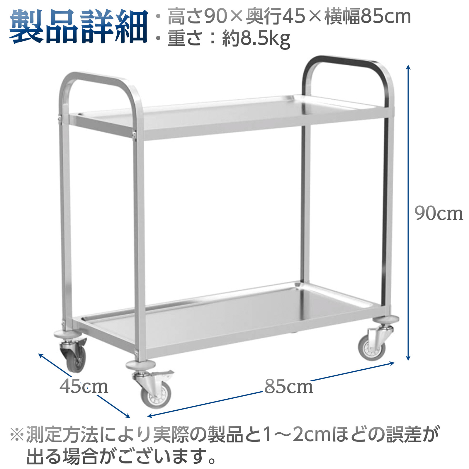 キッチンワゴン 業務用 2段 85cm×45cm ステンレスワゴン キッチンカート キャスター付き 飲食店 ホテル 給食 配膳 食事 爆買
