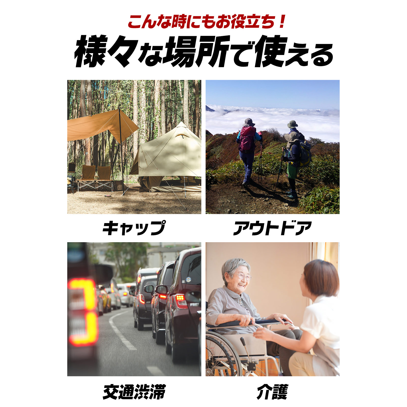 災害時だけでなく、キャンプやアウトドア、渋滞時、介護用など、さまざまなシーンで安心して使えます。