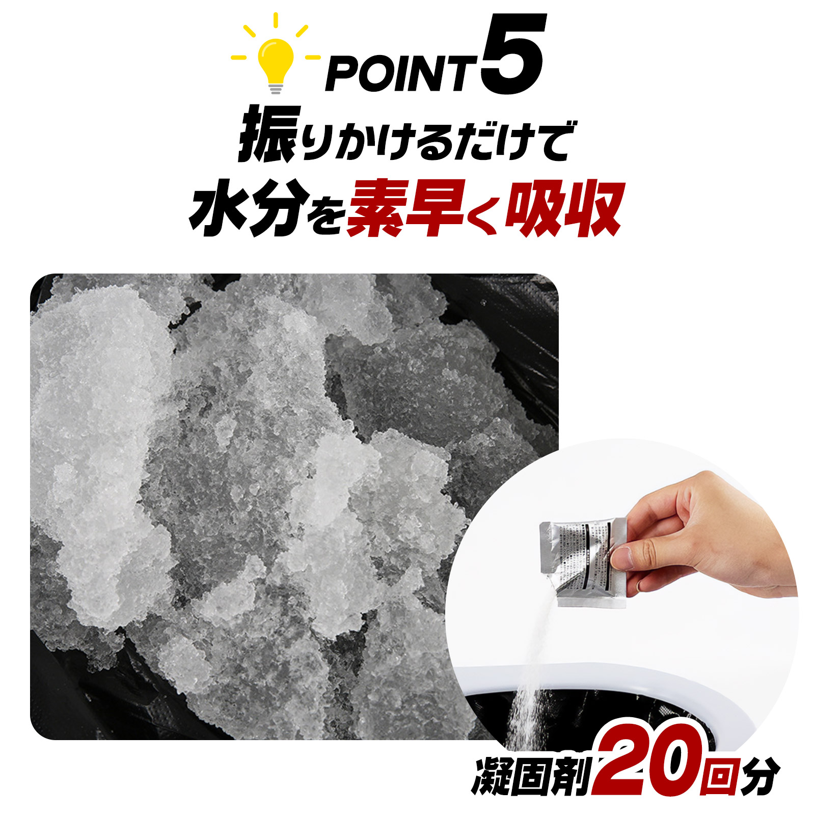 付属の凝固剤は500mlの液体を約30秒で固め、約99.8%の消臭効果で嫌なニオイも安心。