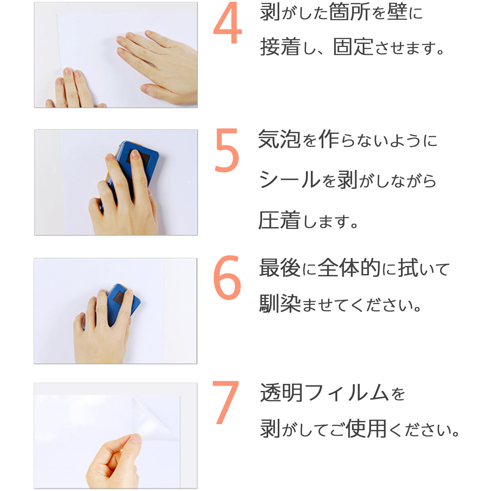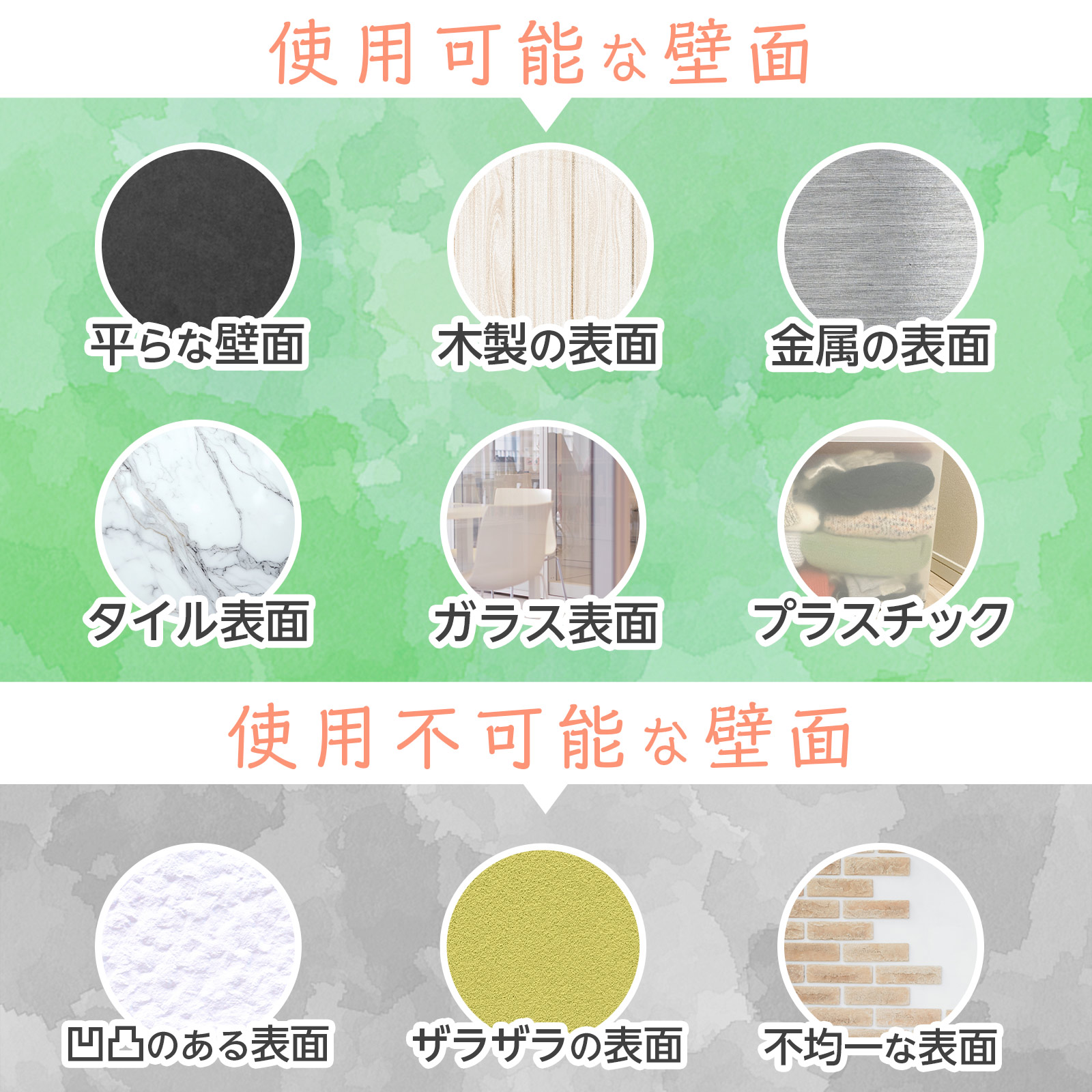 壁面、木製、金属、タイル、ガラス、プラスチックなど幅広い素材に対応。