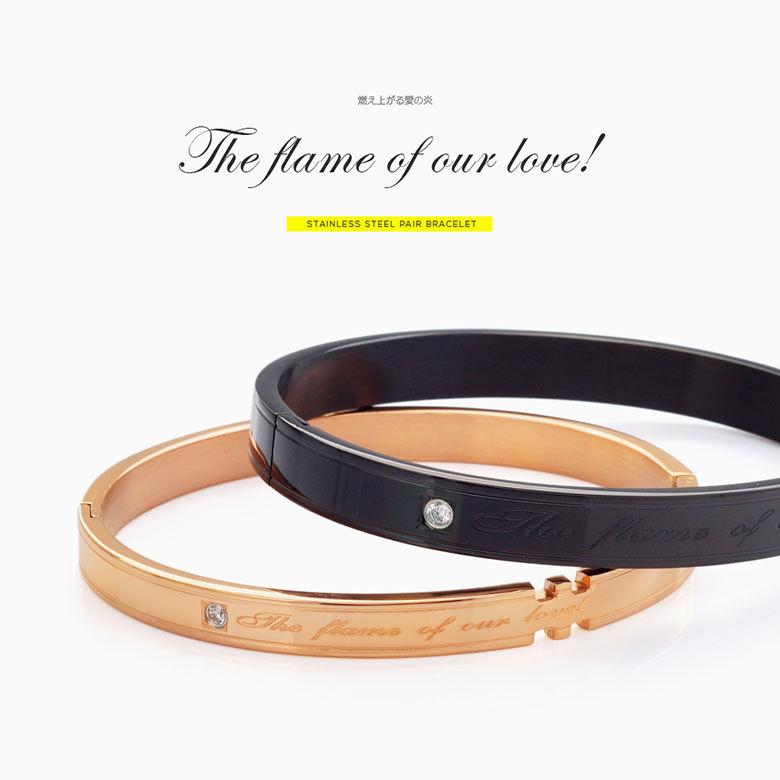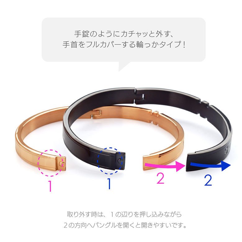 愛の誓いを表現したクロス型カットデザインのステンレス製ペアバングルです。手錠のようにカチャと着け外しする、首をフルカバーする輪っかタイプで、キラリ輝くジルコニアをセットして高級感のある仕上がり。また、ステンレス製なので変色しにくく傷もつきにくいで、金属アレルギーの心配も少なく、つけっぱなしもOKバングルです。(※ペア売りの価格です。1つのご注文で男性用と女性用をセットでお届けします)