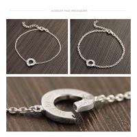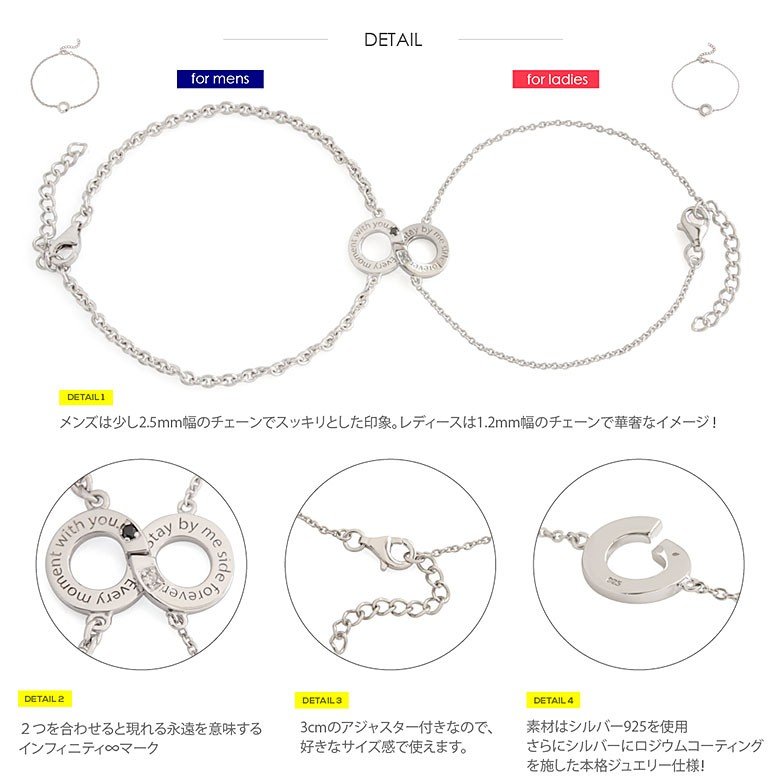 シンプルなリング状のシルバー925製のペアブレスレットです。レディースには「私のそばにずっといて」メンズには「全ての時をあなと過ごします」のメッセージが刻印されており、レディースにはキュービックジルコニア、メンズにはブラックジルコニアがセットされています。また希少金属(レアメタル)のロジウムで表面をコーティングしているので日常環境では変色することもなくアレルギーもほぼ出ないので安心して着けることができる本格的なジュエリーアイテムです!しかも2つのブレスレットを合わせると無限マーク(メビウスの輪:インフィニティ)が現れるデザインになっています。2人の中がずっと続くように願う気持ちが形になったペアアクセサリーです。