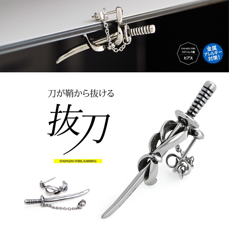 日本刀をモチーフにしたステンレス製のピアスです。見た目のカッコよさとインパクトだけではなく、美しい曲線で作られた鞘から本当に刀を抜くことが出来る凝った構造で作られています。ステンレス製なので金属アレルギー反応が出にくく、使い勝手も抜群!