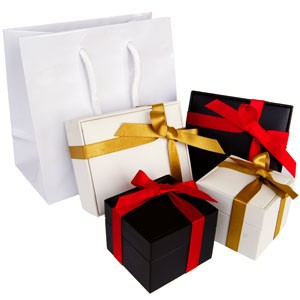 パール調の光沢あるボックスにお入れしてリボンを巻き、手提げ袋に入れます。箱の色はブラックとホワイトがございますのでお選び下さい。