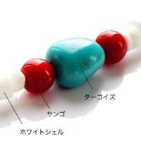 ターコイズ、サンゴ(赤珊瑚)、シェル(貝)を使ったネイティブアメリカン調のアンクレットデザイン!今シーズン注目のカラーリングと天然石を使用したアンクレットで鮮やかな色合いが注目度とセンスアップに力を発揮するアイテム!素足やサンダルスタイルに合わせるのがオススメです!ターコイズは一つ一つの模様や形が違い、その石その石それぞれの表情が楽しめる大粒の物を使用。そして目をひく赤色のサンゴ、そしてターコイズとサンゴの色を目立たせる役割をする白い貝がベストな組み合わせで配置されています。また、ターコイズは古くから「天空の神が宿る石」として危険や邪気を払うとされ、ヒーリングの力を発揮し、一方で、勇気と幸運をもたらせ災いから身を守ってくれる石として有名です。アラビアの商人たちが、その効果にあやかりラクダに身に着けていたことから、旅行のお守りや自動車につけるお守りとしても人気が高い石です。