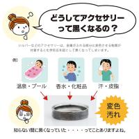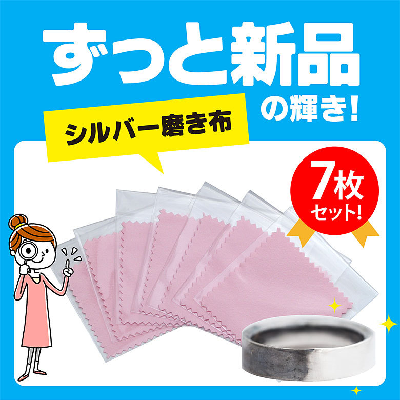 黒くなったアクセサリーをキレイにする、シルバー磨き布(シルバークロス・シルバーダスター)7枚セットです。研磨剤を塗りこんでいるクロス(布)なので変色したり汚れてしまったアクセサリーをキュキュと磨くだけでキレイな色に戻せます。ちょっとガンコな黒ずみや汚れの場合は、少しだけ水を付けてこすると汚れが落としやすくなります。(注意)強い変色が起きてしまった場合は、黒ずみを落とせない場合がありますので、変色が定着する前に(ご使用後など)定期的な汚れや黒ずみ落としにご使用ください。また、布が当たる面をキレイにできるので、布があたらないくぼみの部分や穴の奥などはキレイにできません。研磨剤を含みますので、コーティングされたジュエリーなどに使用するとコーティングがはがれる場合がございます。アクセサリーは繊細に作られているものが多いので磨くときにアクセサリーが破損しないようにご注意ください。