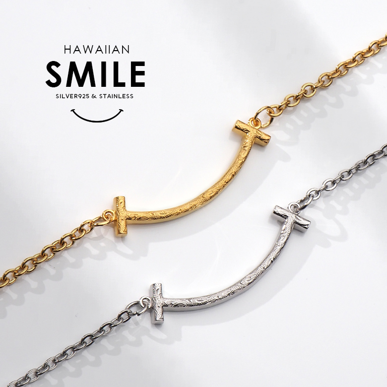 スマイルマークの口元をモチーフにしたアンクレットです。スマイルのシルエットの中にハワイアン模様のスクロール(波)を彫り込んだハワイアンジュエリーで、ハワイアンジュエリーの波模様には、途切れることのない愛や、幸せを運ぶという想いが込められています。変色しにくく、また上質な輝きを持つロジウムと18金でコーティングした2色をご用意しました。肌に触れるチェーン部分は、金属アレルギーが出にくいステンレス製のチェーンを使用しています。スマイル部分の素材は、ハワイアンの彫りが美しく表現できるシルバー925で制作。約3cmのアジャスター付で、21cmから24cm(レディースサイズ)、24cmから27cm(メンズサイズ)で調整可能です。