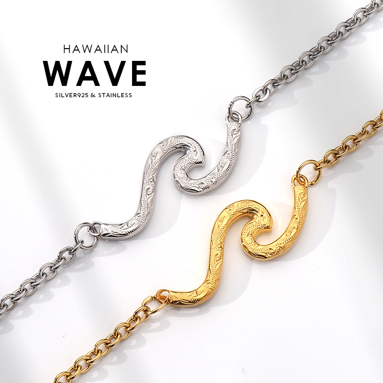 波の形をモチーフにしたアンクレットです。波のシルエットの中に、ハワイアン模様のスクロール(波)を彫り込んだハワイアンジュエリーで、ハワイアンジュエリーの波模様には、途切れることのない愛や、幸せを運ぶという想いが込められています。変色しにくく、また上質な輝きを持つロジウムと18金でコーティングした2色をご用意しました。肌に触れるチェーン部分は、金属アレルギーが出にくいステンレス製のチェーンを使用しています。波部分の素材は、ハワイアンの彫りが美しく表現できるシルバー925で制作。約3cmのアジャスター付で、21cmから24cm(レディースサイズ)、24cmから27cm(メンズサイズ)で調整可能です。