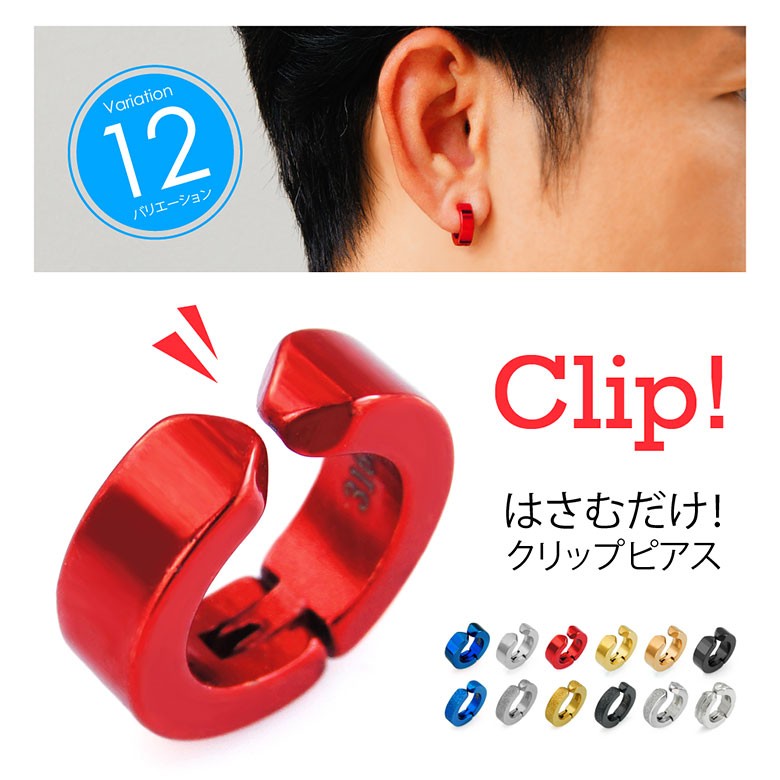 ピアスの穴が無くても大丈夫!はさむだけで装着できるステンレス製のイヤーカフ型クリップピアスです。ピアスの隙間拡げて、着けたい場所にはさむだけの超簡単装着!それだけでピアス穴に通して着けているように見えるフェイクピアスなんです!色の種類やデザインも豊富に12種類取り揃えました。肌にやさしくアレルギーがほとんど出ないといわれるステンレスを使い、傷に強いコーティングを施したとっても取り扱いがしやすいアイテムです。ピアスの穴をあけるのはなぁ。。。と悩んでいる方もう1つ穴をあけるのはなぁと考えている方には是非このピアスがおススメ!男性にも使ってもらいやすいように片耳単位で販売しています!
