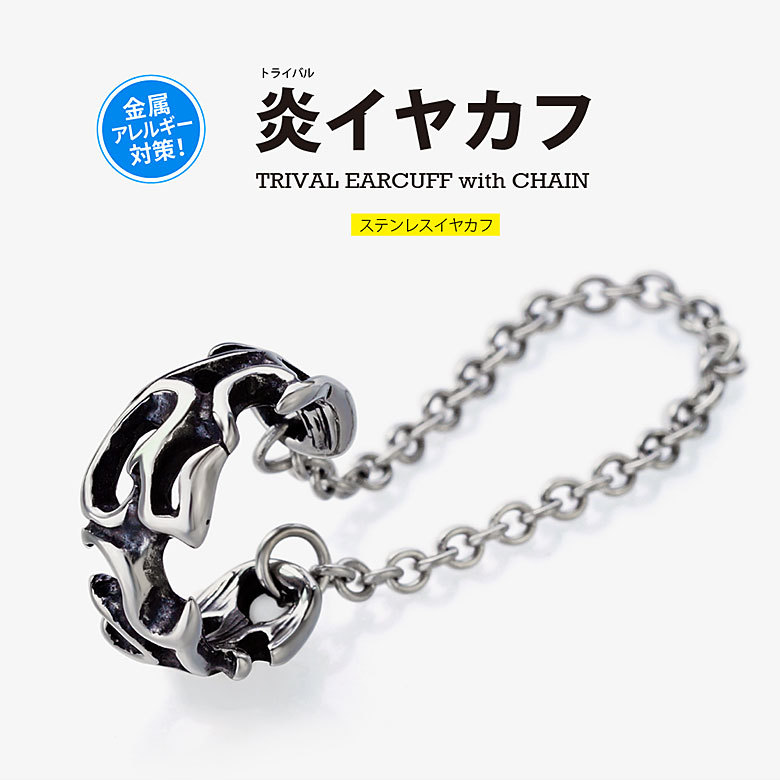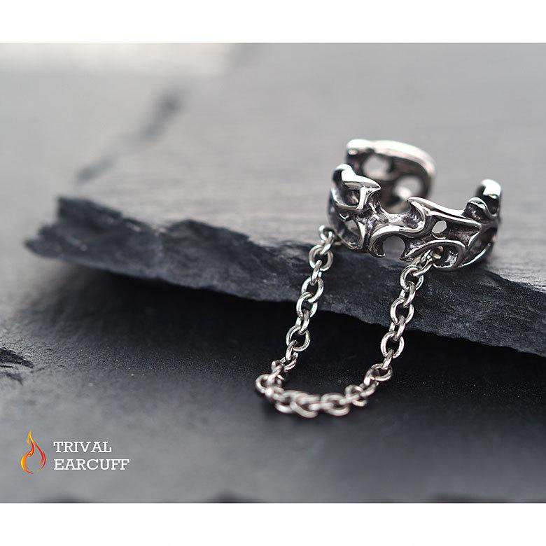 タトゥーで彫られる聖なる炎「トライバル」の模様のイヤーカフです。ステンレス製のイヤカフなので傷づきにくく汚れにくい。アレルギーの心配も少ないのが特徴!イヤーカフにチェーンが付いているので重ね付けのようなボリューム感と存在感を感じさせるデザインです。