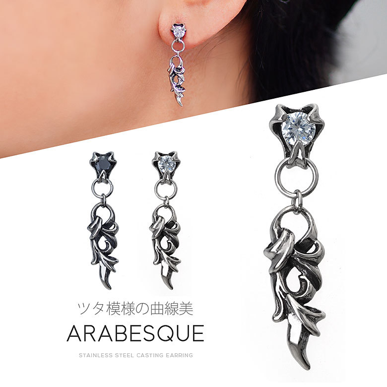 アラベスク模様が揺れるステンレス製のドロップピアスです!ダイヤモンドのように輝くジルコニアのスタッドピアスに立体的に作られた唐草模様(アラベスク模様)のチャームがぶら下がって揺れるデザイン。キャスト(鋳造)で作られているので、ステンレスなのにシルバーアクセサリーのような複雑な造形が可能になりました。またステンレスの特徴である、傷つきにくい、さびにくい、アレルギーを起こしにくいというメリットもプラス!いいとこどりのピアスです。