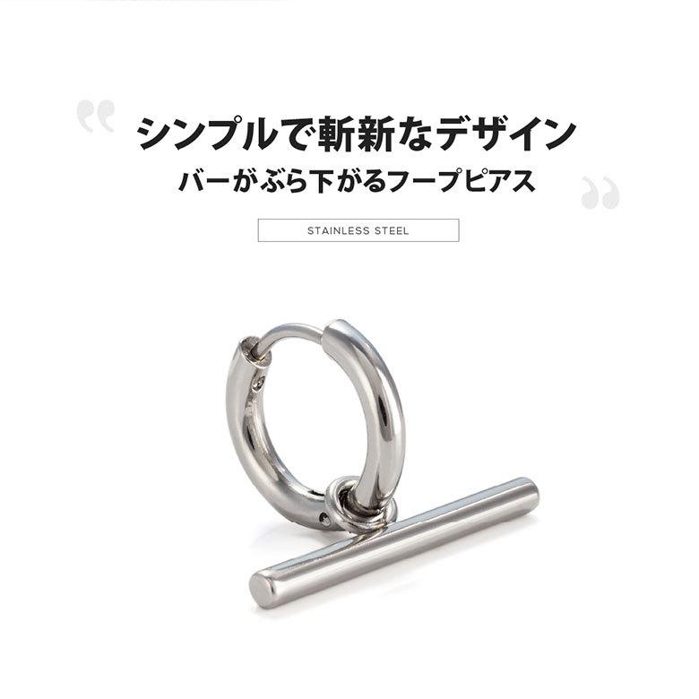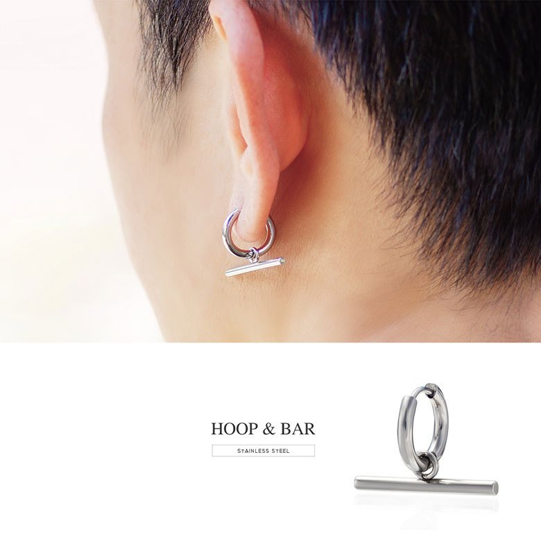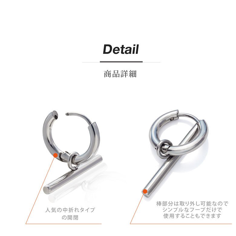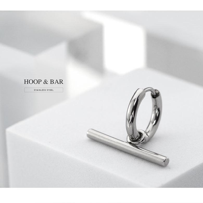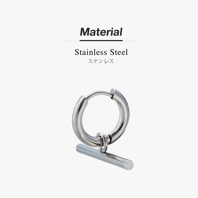 シンプルなフープピアスにバー(棒)がぶら下がるステンレス製ピアスです。シンプルな構造ながらユニークで印象的なデザイン。バー(棒)部分は取り外しできるのでシンプルなフープだけでつけることもできます。また、ステンレス製なので変色しにくく傷もつきにくいのも特徴。金属アレルギーの心配も少ないので、つけっぱなしもOKのピアスです。(※片耳用売りの価格です。両耳用で購入される場合は、2回買い物カゴに入れて下さい。)