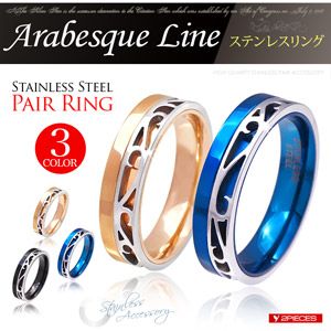 アラベスクのラインが美しいステンレスペアリングです。PVDコーティングのカラーリングに透かし加工のアラベスクのリングを重ねで完成した斬新なデザイン!アラベスクの下から見える鮮やかなカラーがその美しさを倍増させる新感覚ステンレスペアリングです。さらに、リングの内側を丸くカーブさせており、着け心地も追求したアイテムです!光沢のある色のブルー、ブラック、ピンクゴールドの3色をご用意しました。ギフトボックスをセットにしてお届けいたします。