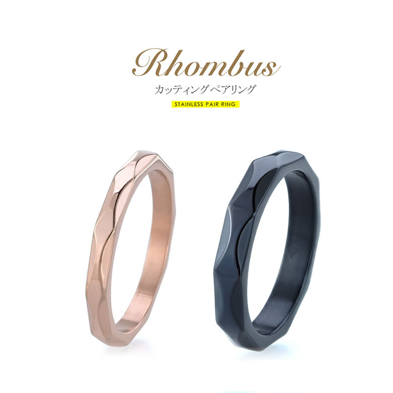 プレーンなリングをひし形模様が浮かぶようにカットしたシンプルで合わせやすいデザインのステンレス製ペアリングです。メンズ用には手元の印象を引き締めるブラックカラー、レディース用には上品で肌なじみの良いピンクゴールドをご用意しました。ステンレス製なので、金属アレルギーや変色、さびなど心配が少なく、つけっぱなしでOKの使いやすい指輪です。