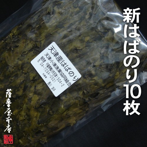 | 名称 | はばのり(新物) | | 内容量 | 10枚入 | | 原材料名 | はばのり | | 原産国 | 日本 | | 原産地 | 千葉 | | 賞味期限 | およそ90日(長期保存の際は要冷凍) | | 保存方法 | 高温多湿、直射日光を避ければ常温保存も出来ますが、変色や風味落ちを防ぐために必ず密封のうえ冷蔵庫または冷凍庫での保存をおすすめします。なお、長期保存の場合は袋ごとアルミホイル等で巻いて遮光し、超低温での冷凍保存をお願いいたします。 | | お召し上がり方 | ゆっくり炙って緑色になったら軽く手で揉んで、熱い雑煮に削り節とともにパラリとかけてお召し上がり下さい。 | | 配送温度帯 | 常温 | | メーカー | 東安房漁協/新勝浦市漁協/鴨川市漁協 | | 販売者 | 株式会社さつま屋 | | 商品説明 | ゆっくりあぶって緑色になったら手でもんで、熱い雑煮に削り節とともにパラリとかけます。昔から漁家を中心に「はば雑煮」がないと正月が迎えられないといわれています。 「はば」は、水温が下がると海苔の成長がよくなり、11月から早春にかけて寒風の中、長さ20cm、幅2cmほどに育ったものを岩から摘んできて、「海苔ず」に広げて風通しのよいところで干し上げる、この地域・この季節の手づくり海苔です。 昔はいくらでもあったこの海の幸も、気候の温暖化や水の汚染、土砂の堆積で年々採れなくなっている貴重な天然の海苔です。 | | 当店のこだわり | 当店のはばのりは、地元・千葉の方々に昔から愛されてきた本場の「はばのり」をお届けしています。「はばのり」とは言っても、そのお値段や品質は様々ありますが、やはり地元千葉の専門店として、当店では漁業協同組合の入札制が敷かれている最高級浜である天津産を中心に「東安房漁協(旧天津小湊漁協)」および「新勝浦市漁協扱」「鴨川市漁協」の3つの漁業協同組合の入札物100%に限定して販売しております。 県内屈指の品質を誇る天津産などと比べて価格的にも非常に割安な「房州産」「南房総産」その他の「県内各産地」など、千葉県内には他にも数々の「はばのり」の生産地がありますが、やはり本場ならではの品質の安定性と漁協入札の信頼性を考え、当店ではこれらの生産地の「はばのり」および一部で流通している通称「浜買い」と呼ばれる漁協入札にかけられていない「はばのり」は一切取り扱いがございませんので、どうぞご安心してお買い求め下さい。 | | ヒネはばとは | 通称ヒネと呼ばれる「はばのり」は、年明け後に春先にかけて摘んだ「春物」のはばのりで、年末の時期まで冷凍保管されて一般的には「新はばのり」に先駆けて販売されるものです。 | | 新はばの発売時期 | 新はばのりについては、毎年12月23日〜25日頃が各漁協入札日となっており、当店には入札当日の夜に入荷され、翌日より出荷を行ってまいります。 | | ヒネはばのり10枚 | H29年9,800円/H28年12,500円/H27年8,900円/H26年6,700円/H25年5,200円/H24年5,200円/H23年4,300円/H22年4,900円/H21年4,500円/H20年4,500円 <過去の税別価格/送料込> | | 新はばのり10枚 | H29年10,900円/H28年12,500円/H27年13,500円/H26年9,200円/H25年8,500円/H24年5,780円/H23年6,980円/H22年5,400円/H21年7,200円/H20年6,200円 <過去の税別価格/送料込> | | 新はばのり30枚 | H29年30,700円/H28年34,500円/H27年取扱なし/H26年26,520円/H25年24,450円/H24年16,290円/H23年19,890円/H22年15,150円/H21年20,550円/H20年17,550円 <過去の税別価格/送料込> | | 新青海苔20枚 | H29年取扱なし/H28年取扱なし/H27年取扱なし/H26年4,100円/H25年4,200円/H24年4,200円/H23年3,980円/H22年3,600円/H21年4,200円/H20年3,950円 <過去の税別価格/送料込> | | 新青海苔100枚 | H29年取扱なし/H28年取扱なし/H27年取扱なし/H26年18,500円/H25年19,000円/H24年19,000円/H23年17,750円/H22年取扱なし/H21年取扱なし/H20年17,750円 <過去の税別価格/送料込> | | 検索キーワード | 新ハバ・はば・はんば・海苔・天津・小湊・鴨川・雑煮・お正月・青海苔・一松・青のり・漁協・おせち・千葉・食べ方・色・緑・黒・房州・房総・新・ヒネ・南白亀・川・ひとつまつハバ・ノリ |