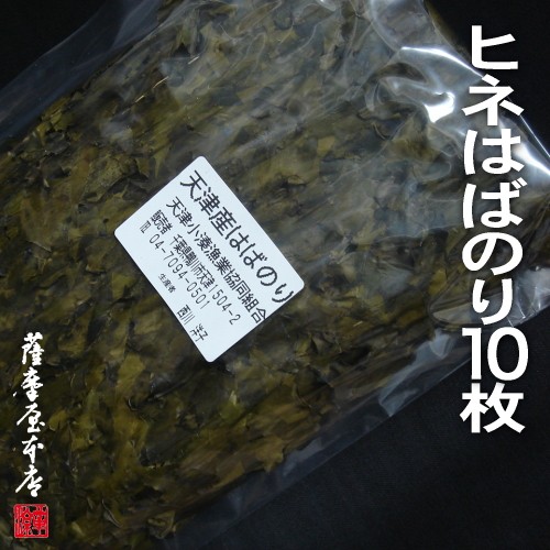 | 名称 | はばのり(ヒネ) | | 内容量 | 10枚入 | | 原材料名 | はばのり | | 原産国 | 日本 | | 原産地 | 千葉 | | 賞味期限 | およそ90日(長期保存の際は要冷凍) | | 保存方法 | 高温多湿、直射日光を避ければ常温保存も出来ますが、変色や風味落ちを防ぐために必ず密封のうえ冷蔵庫または冷凍庫での保存をおすすめします。なお、長期保存の場合は袋ごとアルミホイル等で巻いて遮光し、超低温での冷凍保存をお願いいたします。 | | お召し上がり方 | ゆっくり炙って緑色になったら軽く手で揉んで、熱い雑煮に削り節とともにパラリとかけてお召し上がり下さい。 | | 配送温度帯 | 常温 | | メーカー | 東安房漁協/新勝浦市漁協/鴨川市漁協 | | 販売者 | 株式会社さつま屋 | | 商品説明 | ゆっくりあぶって緑色になったら手でもんで、熱い雑煮に削り節とともにパラリとかけます。昔から漁家を中心に「はば雑煮」がないと正月が迎えられないといわれています。 「はば」は、水温が下がると海苔の成長がよくなり、11月から早春にかけて寒風の中、長さ20cm、幅2cmほどに育ったものを岩から摘んできて、「海苔ず」に広げて風通しのよいところで干し上げる、この地域・この季節の手づくり海苔です。 昔はいくらでもあったこの海の幸も、気候の温暖化や水の汚染、土砂の堆積で年々採れなくなっている貴重な天然の海苔です。 | | 当店のこだわり | 当店のはばのりは、地元・千葉の方々に昔から愛されてきた本場の「はばのり」をお届けしています。「はばのり」とは言っても、そのお値段や品質は様々ありますが、やはり地元千葉の専門店として、当店では漁業協同組合の入札制が敷かれている最高級浜である天津産を中心に「東安房漁協(旧天津小湊漁協)」および「新勝浦市漁協扱」「鴨川市漁協」の3つの漁業協同組合の入札物100%に限定して販売しております。 県内屈指の品質を誇る天津産などと比べて価格的にも非常に割安な「房州産」「南房総産」その他の「県内各産地」など、千葉県内には他にも数々の「はばのり」の生産地がありますが、やはり本場ならではの品質の安定性と漁協入札の信頼性を考え、当店ではこれらの生産地の「はばのり」および一部で流通している通称「浜買い」と呼ばれる漁協入札にかけられていない「はばのり」は一切取り扱いがございませんので、どうぞご安心してお買い求め下さい。 | | ヒネはばとは | 通称ヒネと呼ばれる「はばのり」は、年明け後に春先にかけて摘んだ「春物」のはばのりで、年末の時期まで冷凍保管されて一般的には「新はばのり」に先駆けて販売されるものです。 | | 新はばの発売時期 | 新はばのりについては、毎年12月23日〜25日頃が各漁協入札日となっており、当店には入札当日の夜に入荷され、翌日より出荷を行ってまいります。 | | ヒネはばのり10枚 | H29年9,800円/H28年12,500円/H27年8,900円/H26年6,700円/H25年5,200円/H24年5,200円/H23年4,300円/H22年4,900円/H21年4,500円/H20年4,500円 <過去の税別価格/送料込> | | 新はばのり10枚 | H29年10,900円/H28年12,500円/H27年13,500円/H26年9,200円/H25年8,500円/H24年5,780円/H23年6,980円/H22年5,400円/H21年7,200円/H20年6,200円 <過去の税別価格/送料込> | | 新はばのり30枚 | H29年30,700円/H28年34,500円/H27年取扱なし/H26年26,520円/H25年24,450円/H24年16,290円/H23年19,890円/H22年15,150円/H21年20,550円/H20年17,550円 <過去の税別価格/送料込> | | 新青海苔20枚 | H29年取扱なし/H28年取扱なし/H27年取扱なし/H26年4,100円/H25年4,200円/H24年4,200円/H23年3,980円/H22年3,600円/H21年4,200円/H20年3,950円 <過去の税別価格/送料込> | | 新青海苔100枚 | H29年取扱なし/H28年取扱なし/H27年取扱なし/H26年18,500円/H25年19,000円/H24年19,000円/H23年17,750円/H22年取扱なし/H21年取扱なし/H20年17,750円 <過去の税別価格/送料込> | | 検索キーワード | 新ハバ・はば・はんば・海苔・天津・小湊・鴨川・雑煮・お正月・青海苔・一松・青のり・漁協・おせち・千葉・食べ方・色・緑・黒・房州・房総・新・ヒネ・南白亀・川・ひとつまつハバ・ノリ |