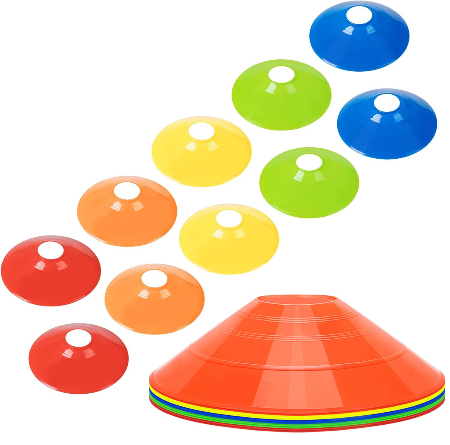 製品は以下を含む:マーカーコーンx10個、袋x1個。(赤x2、青x2、緑x2、オレンジx2、黄x2)