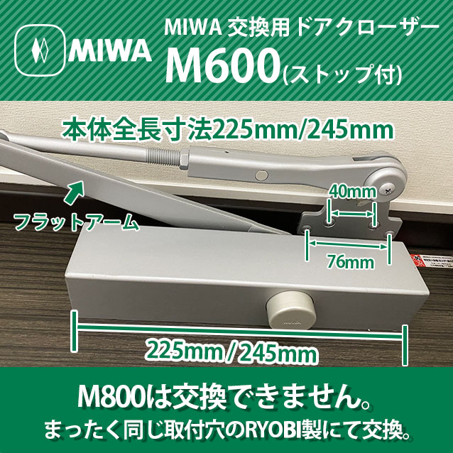MIWA(美和ロック株式会社) 交換用ドアクローザー M602PS(M603PS)【ストップ付】本体全長寸法225mm/245mm シルバー ブロンズ