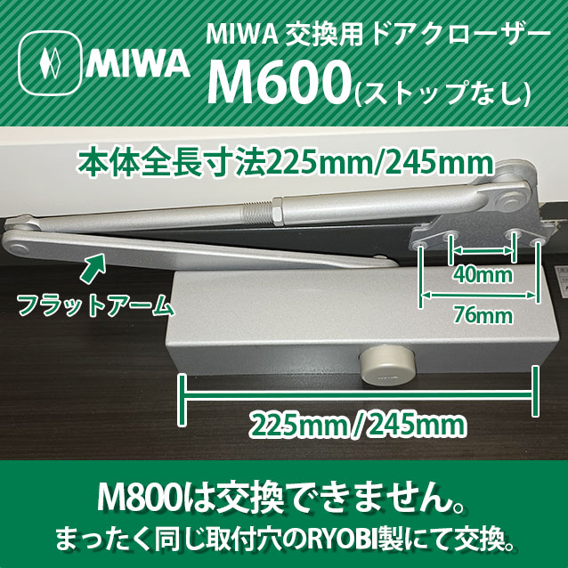 MIWA(美和ロック株式会社) 交換用ドアクローザー M602P(M603P)【ストップなし】本体全長寸法225mm/245mm シルバー ブロンズ