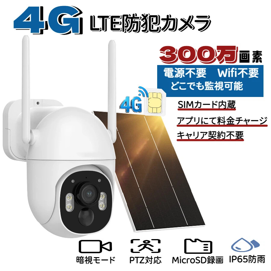 \好評につき再入荷!/防犯カメラ 4G LTE ワイヤレス 屋外 ソーラー 300万画素 工事不要 電源不要 WiFi不要 専用アプリ 4G通信 夜間カラー暗視 人体検知 庭畑池