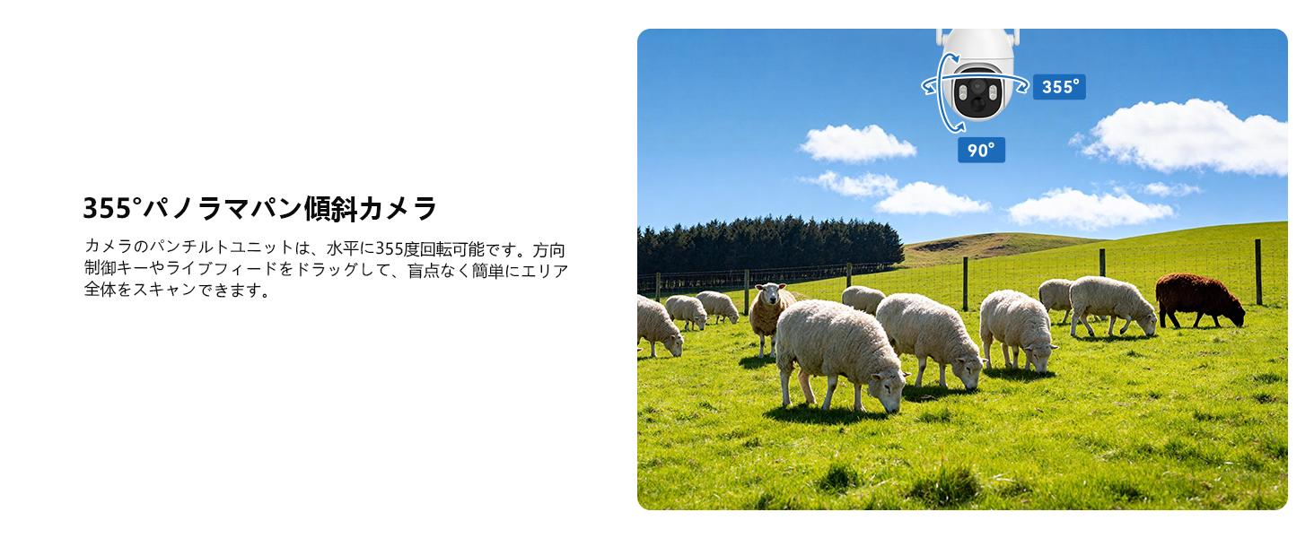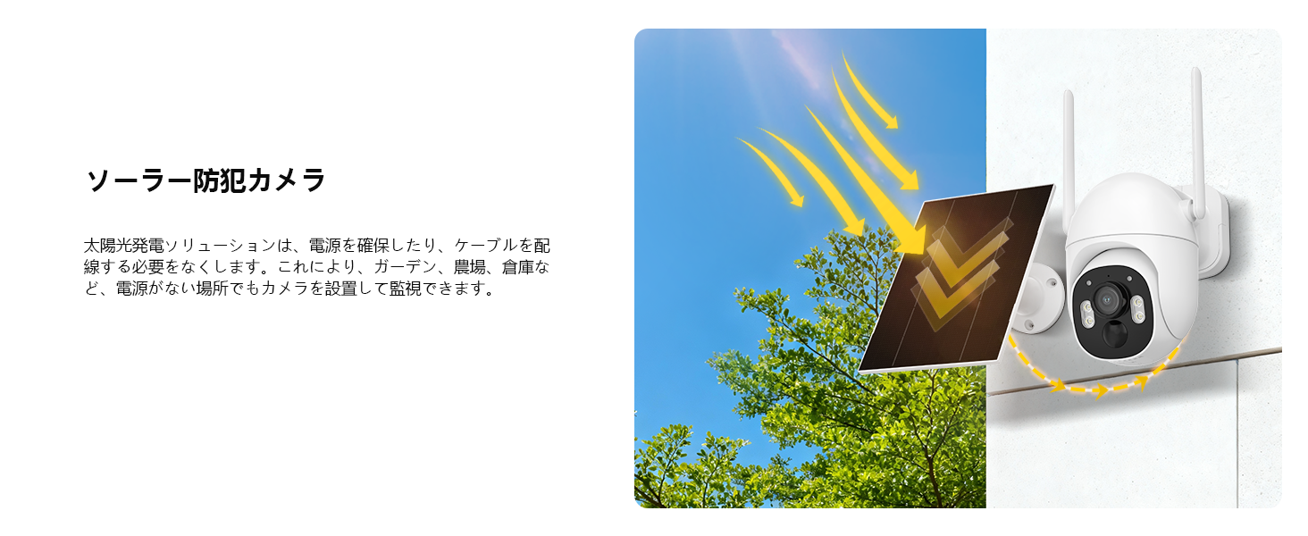 1台で広範囲をカバーし、防犯力がアップ。ソーラーパネルで電源確保も簡単、屋外設置にも最適です。