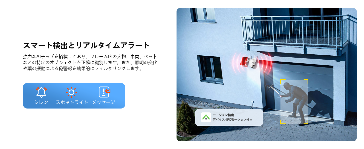 人を検知するとLEDライトが点灯し、夜間もカラーで高精細映像。音声警報と発光で犯罪を威嚇。誤報を減らすため、検知エリアを設定可能。