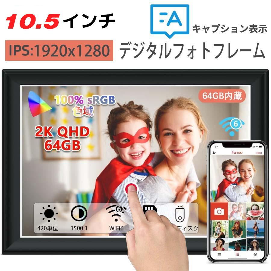 10.5インチのWi-Fiデジタルフォトフレームには、FHD(1920×1280)解像度の高品質IPSタッチスクリーンを搭載。どの角度から見ても、美しく鮮明な映像をお楽しみいただけます。 | | 64GBの大容量メモリ内蔵