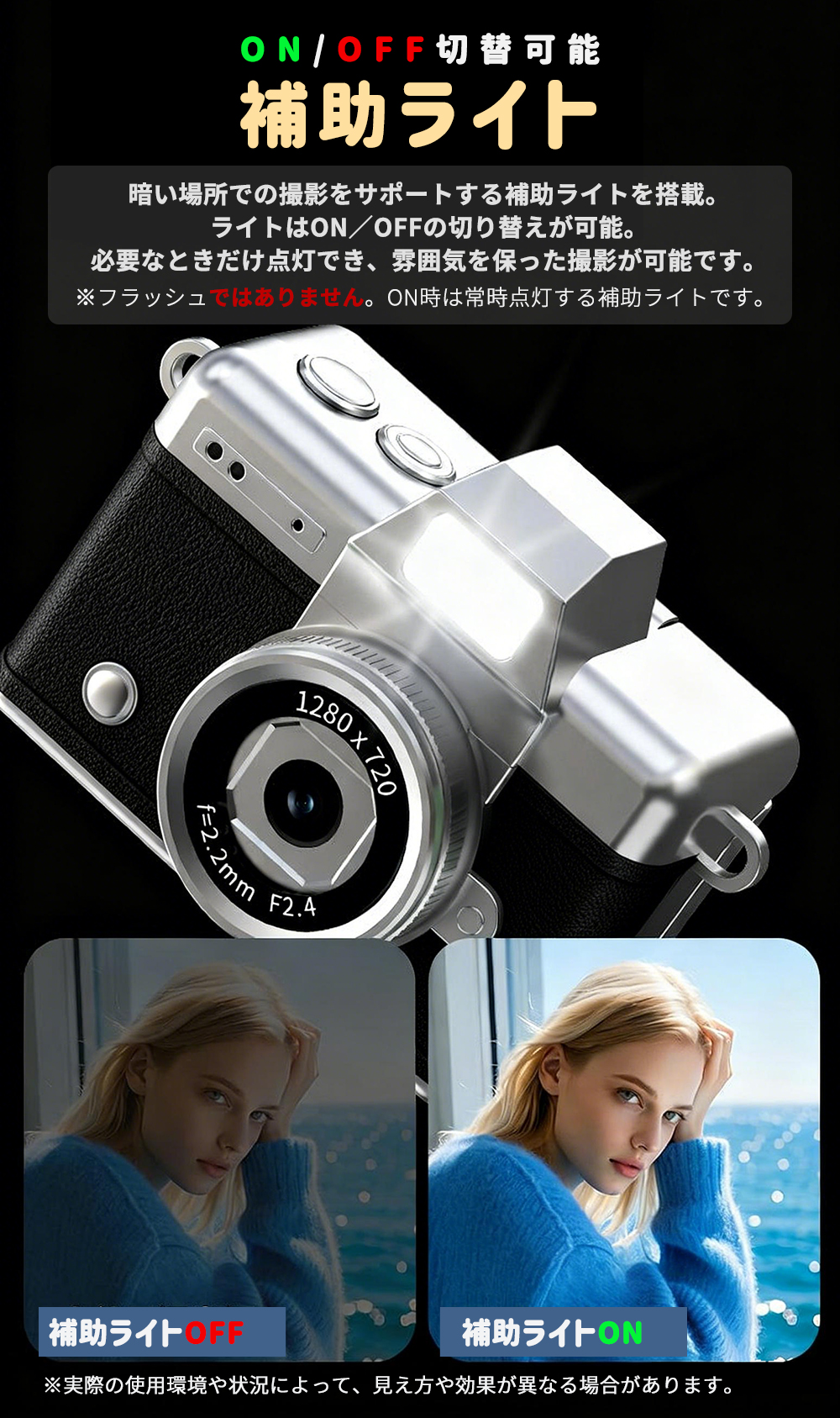 ON/OFFの切替が可能で、暗い場所でも快適に撮影できます。