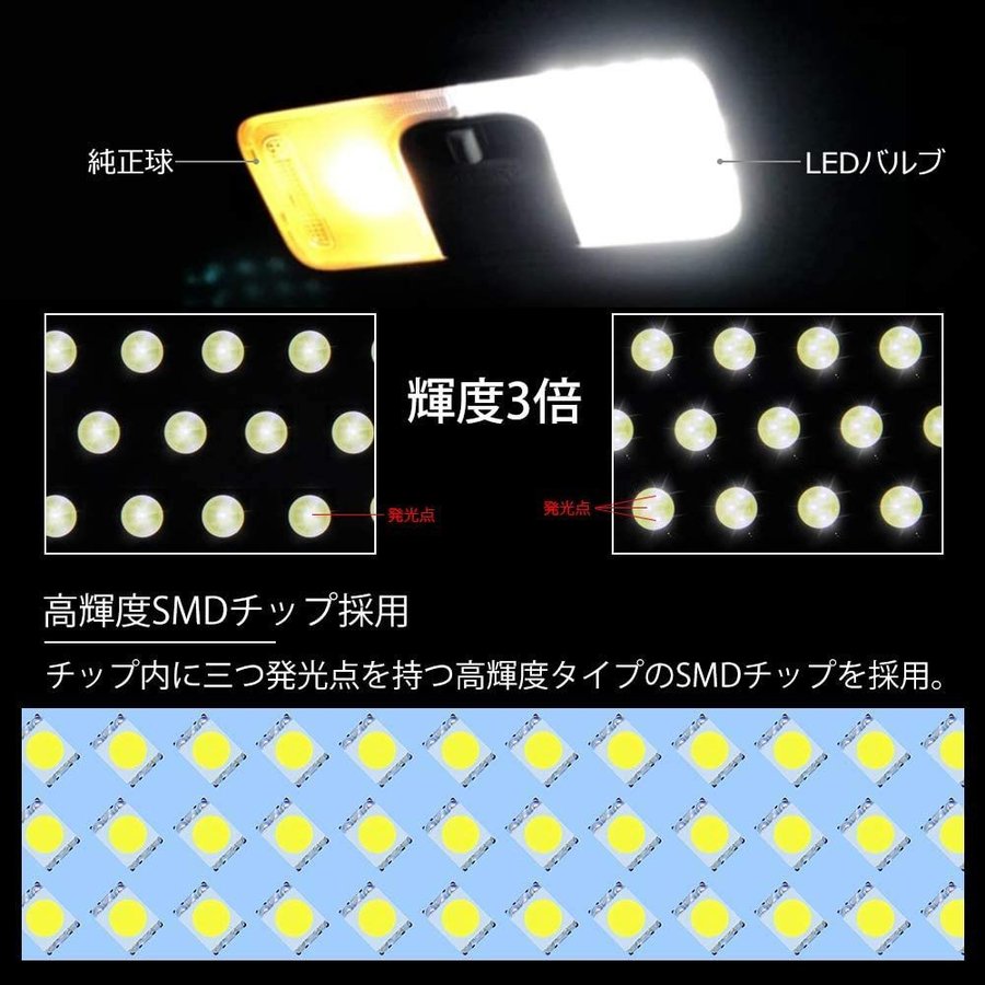 ★高輝度LEDチップ採用:本製品は車の室内の明るさを求めるために、一つLEDの中に発光点が三つ搭載されている3チップSMDを採用し、驚くほど室内を明るく照らします。