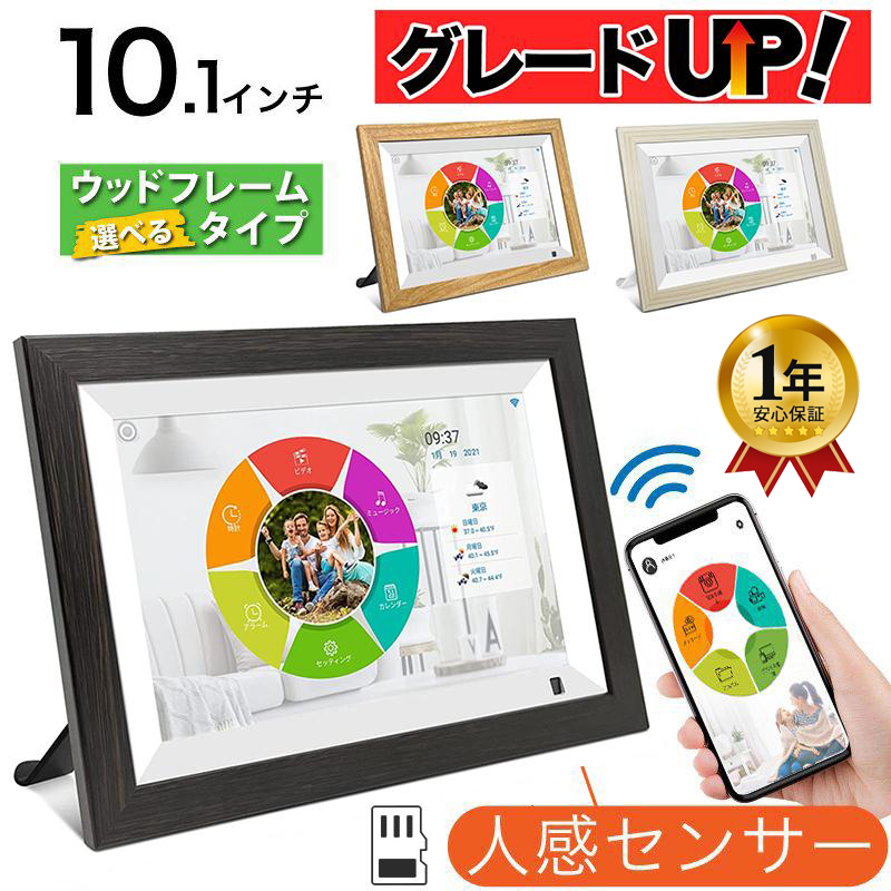 デジタルフォトフレーム wifi 32GB内蔵 写真立て パッテリー給電対応 人感センサー 木製 壁掛け 10.1インチ 1280*800高画質 音楽写真動画再生 遠隔転送 moonka