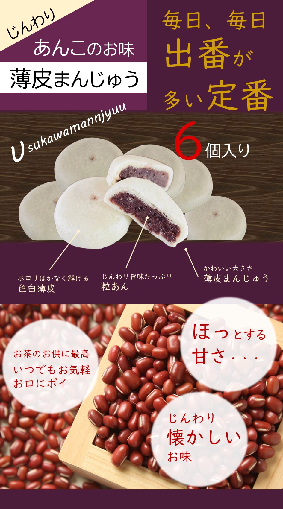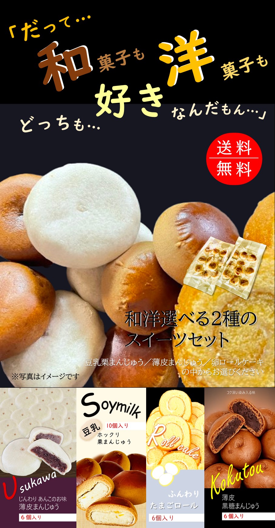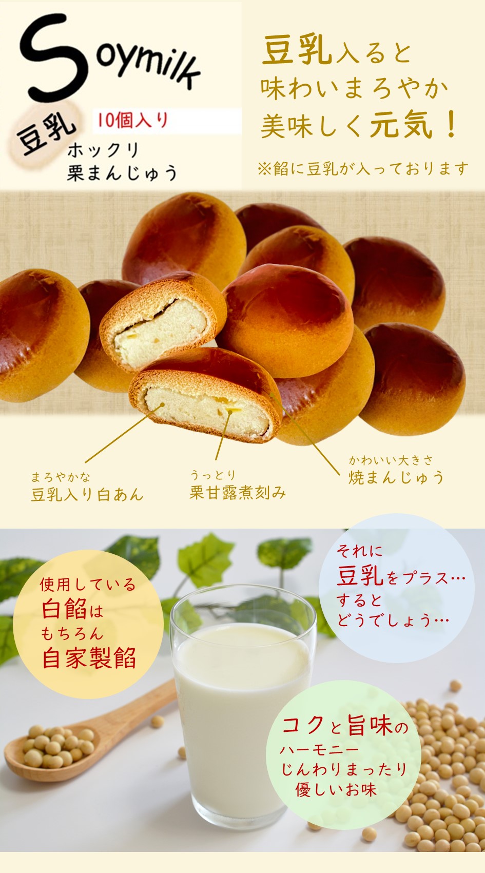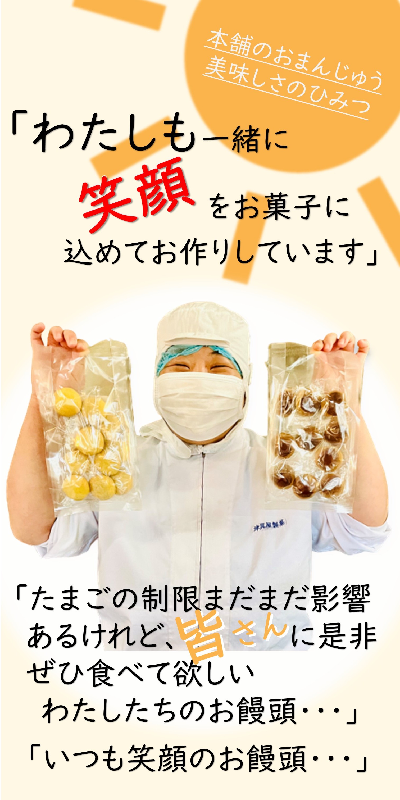 | 栄養成分表示 | [薄皮まんじゅう]1個当たり [薄皮黒糖まんじゅう]1個当たり [豆乳栗まんじゅう]1個当たり [たまごロール]1個当たり |