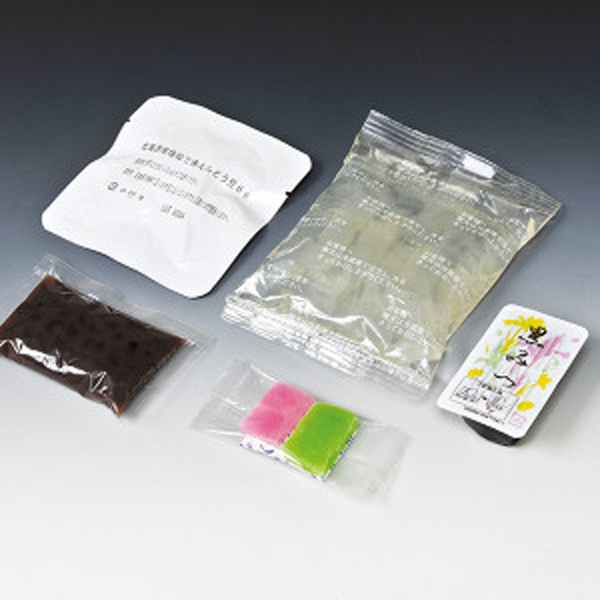 大きめにカットした寒天と北海道産小豆を使用したたっぷりサイズ(40g)の小倉あん、黒糖の風味豊かな黒蜜ポーション、天然着色料を使用した赤と緑が1ヶずつセットされたぎゅうひ、北海道産赤えんどうの塩茹でが付いています。