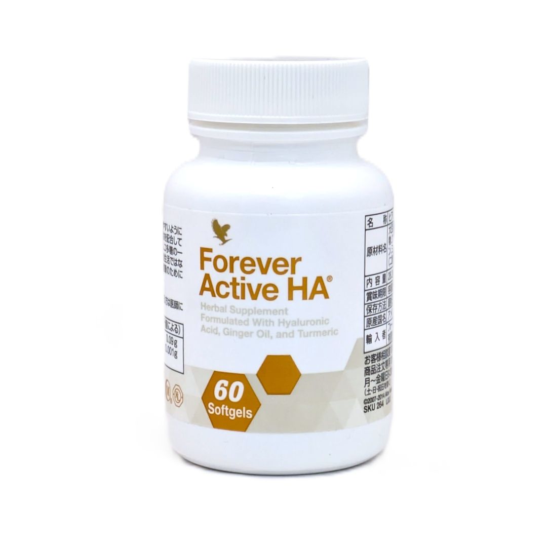 フォーエバー アクティブ HAは、吸収されやすいように低分子化されたヒアルロン酸とウコン、生姜油を配合した健康食品です。