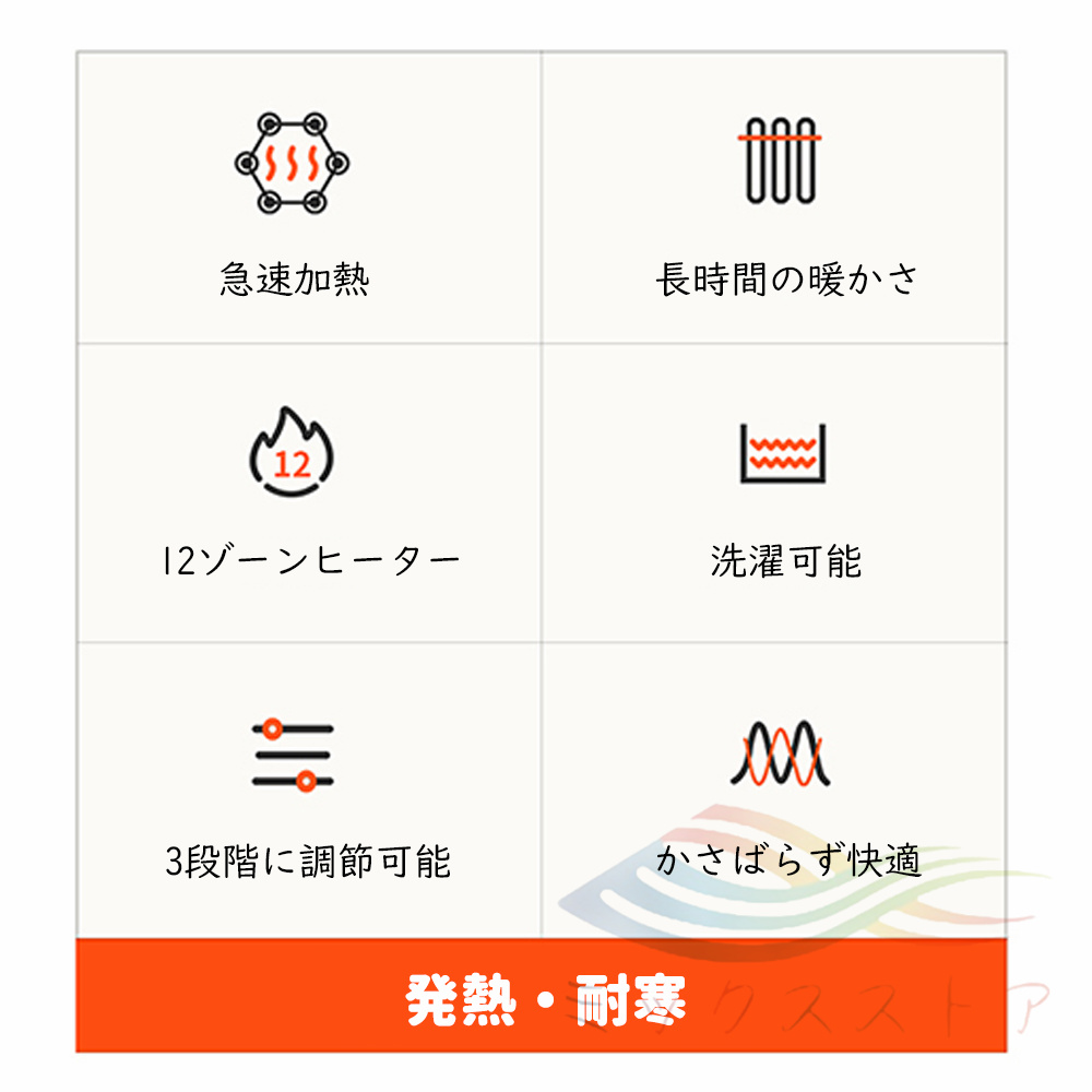 ●電熱機能:カーボン繊維製のヒーター、USB接続式、智能加熱、三段階温度調節、水洗濯可能