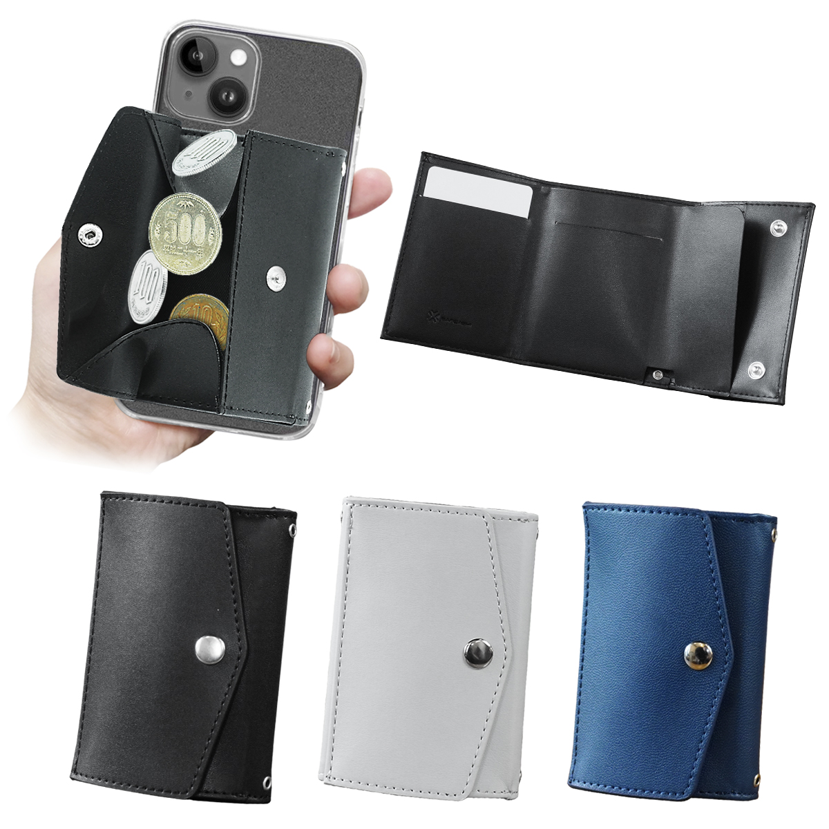 「ミニ財布として使いたいけど、スマホ財布でも使いたい」そんな方へおすすめできる、ボックス型ミニ財布です。付属のマウントをスマホ背面に貼り付けることで、財布をそのままスマホへドッキングできる次世代スマホ財布です。「小銭20枚」「紙幣8枚」「カード4枚」に対応。【ミニサイズ】カードサイズに匹敵する、小さな財布。手のひらに収まるサイズだから、ポケットがかさばりません。【財布形状】三つ折りタイプなので、お札をあらかじめ折り畳んで収納するような手間はありません。【ボックスタイプ】小銭の出し入れをしやすいように、ボックス形状を採用。大容量で小銭を収納できます。【電磁波防止】財布中面のカードポケットの2箇所には、電磁波を防止するシートを裏生地と使用。【財布容量】紙幣8枚/カード4枚/小銭20枚/鍵1個※組み合わせで収納容量は変わります。【スマホ財布に】付属のマウントをスマートフォンの背面に貼り付けることで、スマホと財布をドッキングできる。【財布の着脱が自由】スマホと財布の取り付けは、専用のマウントを利用した取り付け方法で、財布の着脱が自在にできます。【iPhoneでもandroidでも】スマホ財布として使う場合に、機種は問いません。もちろん専用のケースも必要なし。【ショルダー財布】ショルダーストラップも付属しているので、ショルダー財布としての利用も。また、スマホも取り付ければ、より手軽に利用ができる「ショルダースマホ財布」としても使えてとっても便利です。【ワイヤレス充電対応】財布の着脱が自由なので、財布を外せばワイヤレス充電に対応● 素材:合皮● サイズ:約W68×H98×D11(最薄部)〜24mm● 重量:約43g● 収納容量:(約)カード4枚・お札8枚・コイン20枚・鍵1つ※収納する内容物によって、収納できる容量数は変化します。● iPhoneやandroid等のスマートフォンへ、ドッキングできる。●同梱物:商品本体・マウント(財布取付用パーツ)・マウント取付ガイド・ショルダーストラップ(合皮ブラック)【ご購入前にご確認ください】● 本製品を使用しての事故や端末の傷、故障、データの損失などに関しては、当社では一切の責任を負いかねます。● 本製品を用途以外の目的には使用しないでください。● 本製品が濡れた場合は、乾いた柔らかい布で拭いてください。● 高温、多湿、直射日光の当たる場所など環境変化の大きな場所での長期保管はしないでください。商品劣化の原因となります。● 写真やイラストはイメージです。実際の商品とは異なる場合があります。● 幼児の手の届かない場所へ保管してください。●本製品にスマートフォンを取り付けてご使用される場合、スマートフォンの機種によっては磁気カードに誤作動を与える可能性があります。万が一カードの読み込みエラー等発生した場合、当社では一切の責任を負いかねます。● デザイン/仕様などは改良のため予告なく変更する場合があります。● お客様のご使用状況や環境などにより、変色する場合があります。●本製品の使用過程で発生した色落ち、色移りにつきましては、当社では一切の責任を負いかねます。● コバ*処理を行っている商品は、劣化/消耗により剥がれる恐れがございます。※コバとは、革製品の切れ端、切り口部分のコーティングを指します。●本製品に強い衝撃を与えたり、必要以上にねじったり、重い物を載せないでください。変形や破損の原因となります。●本製品にスマートフォンを装着し、またショルダーストラップをつけ使用した場合に、上下に揺れるような激しい動きをしたりすると、財布からスマートフォンが外れる場合があります。またお使いのスマートフォンの大きさやケースの素材によっては嵌合がゆるくなる場合があります。必ず事前に動作確認をし、注意してご使用ください。ゆるく感じた場合はショルダーストラップとの併用はお控えください。万が一端末の傷や故障等が発生した場合、当社では一切の責任を負いかねます。●ショルダーストラップをご使用し、身体からショルダーストラップを外す場合は、先にスマートフォンを財布から外してからショルダーストラップを外してください。もしくは財布とスマートフォンを掴んだ状態でショルダーストラップを外してください。ショルダーストラップにスマートフォンを装着した状態で外すと、外す際の上下の動きで不意にスマートフォンが外れ、落下の原因となるためです。ご注意ください。●取付用マウントは、次の素材には貼りつけることができません。(1)シリコン素材(2)ガラス素材(3)インキ塗装が施された素材(4)表面に凹凸がある素材、(5)表面がサラサラとする素材には適しておりません。*光沢のあるPC(ハード) 素材・光沢のあるTPU(ソフト)素材・レザー素材(表面に凹凸がないもの)は、適した素材ですので、そういったケースにマウントを貼り付けてご使用ください。*マウントは、強力な粘着シールで貼り付けますので、貼りつけてその後剥がす場