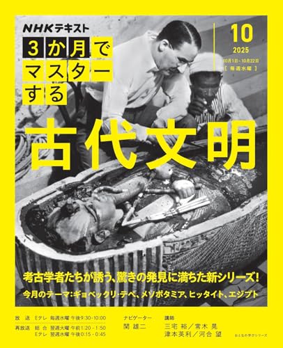 「古代文明」を見つめることで、今この世界の見方が変わる! 世界史、江戸時代に続く「3か月でマスターする」歴史編の第3弾は、近年、新事実が次々と明らかになる「古代文明」。これまで西洋近代の視点からの解明が主流だった考古学の世界でも、21世紀の脱・西洋中心歴史観の潮流の中で、これまで常識とされてきたことが次々と覆されている。 そんな新潮流を、全12回、12か所の文明を取り上げ、時代、場所ともに壮大なスケールで紹介する3か月シリーズ。1冊目では、「文明の始まり」「メソポタミア」「ヒッタイト」「エジプト」について取り上げる。 謎めいた雰囲気やロマンといった憧れの対象としての「古代文明」鑑賞に留まらず、今の時代にも響く、“人間が多様な地域で生きる手法”や、それぞれの“文明の知恵”にもフォーカスし、“なぜ古代文明を見つめるのか”という視点を大切にしながら、現代を考えるヒントを提案する。 第1回:衝撃!最古の巨大遺跡 見直される“文明の始まり” ゲスト研究者:三宅 裕 文明は農耕の発達とともに大河の流域で生まれた…。その定説を大きく揺るがす衝撃の遺跡がトルコ東部、川のない丘の上で発掘された。「ギ