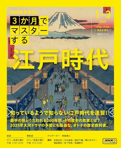 知っているようで知らない”江戸時代”を、わかりやすく解説 2024年4月に始まった教養番組「3か月でマスターする」。「世界史」、「数学」、「ピアノ」に続く第4弾は、「江戸時代」。 この時代、現代につながる文化や学問、経済、政治の仕組みなどが生まれ、発展し、江戸は世界の大都市に成長。まさに、日本の歴史の転換点といえる。 江戸時代を学ぶことは日本を学ぶこと。歴史感覚を取り戻し、養うのは、今後日本がどのような進路をたどるのかを知ることにつながる。 そこで、最新研究による新説を交え、江戸時代の通史をわかりやすく解説。 江戸が舞台の2025年度大河ドラマ「べらぼう」に関する特別企画も収載する。 教科書で習った知識をアップデートし、歴史の奥深さに触れよう。 【テキスト企画】江戸時代ってこんな時代! 第1回 「天下泰平」の世はなぜ生まれたのか 第2回 幕府は「百姓・町人」とどう向き合ったのか 第3回 本当は「鎖国」してなかったってホント 第4回 「文治政治」は何を生んだ 第5回 華やかな「元禄文化」はどのように生まれた 第6回 なぜ立て続けに「改革」した 1徳川吉宗~田沼意次 第7回 「鎖国」下