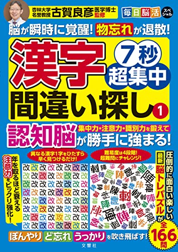 ☆★☆杏林大学 名誉教授 古賀良彦 医学博士 監修☆★☆ 漢字間違い探しにはこんな脳活効果があります! 1. 認知力向上 2. 記憶力向上 3. 集中力向上 4. 注意力向上 5. 識別力向上 6. 判断力向上 大人気の毎日脳活シリーズに全く新しい漢字パズル「漢字間違い探し」が登場! 漢字間違い探しは同じ漢字がたくさん並ぶなかに 1字だけ隠れている似たつくりの異なる漢字を できるだけ早く探すパズルです。 集中力・注意力・判断力を鍛えて 認知脳がぐんぐん強まります。 日頃、ぼんやりやど忘れ・うっかりが気になる方に最適! 難易度は4段階に分かれており 面白く楽しく夢中で解くことができます。