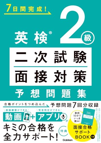 ★★★ 予想問題【7回分】収録! ★★★ 面接のシミュレーションができる「動画」や、自分の発音判定ができる「アプリ」で、あなたの合格を全力サポート! ■動画を見ながら、面接のシミュレーションができる! 巻頭のカードの二次元コードをスマホで読み取って、動画にかんたんアクセス!動画を見ながら7回分の面接が体験できます。あなたが話すターンが来たら、自分の解答を言ってみましょう。 ■「発音判定機能」で、自分の発音に自信がつく! 書籍に掲載されているパッセージや解答例は、アプリの「発音判定機能」に対応。アプリを使った音読トレーニングで“発音”の精度を高め、自信をもって本番に挑みましょう。 ■はじめての二次試験受験にとことん寄り添った内容&特典! 合格ポイントをつめ込んだ問題と、わかりやすい解説。また、試験直前まで持ち運べるミニブック『直前10分でいっき読み!面接合格お守りBOOK』も付いています。