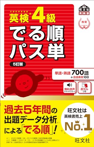 英検単語集の超定番「でる順パス単」シリーズ! 1998年シリーズ刊行、信頼と実績のロングセラー単語集の5訂版です。 本書の特長 ★「でる順」だから効率的に覚えられる! ★学習をサポートする無料音声つき! ★学習効果がわかるテストつき! 各特長の詳細は以下の通りです。 ★「でる順」だから効率的に覚えられる! 過去5年分の英検過去問題を徹底分析し、よく出題される語を「学校で習う単語」「英検にでる単語」に分けて掲載しました。 ★学習をサポートする無料音声つき! 音声ダウンロード・アプリ対応なので、スマホやパソコンで簡単に音声をお聞きいただけます。 ★学習効果がわかるテストつき! 「単語編」「熟語編」には見出し語を覚えたか確認できるテストがついています。 ※本書の音声は、公式アプリ「英語の友」でお聞きいただけます。詳しくは、公式サイト(英語の友で検索! )をご覧ください。 ※本書は、2012年3月に刊行された『英検4級でる順パス単』を改訂したものです。 主な改訂ポイント ・英検過去問分析データに基づき、収録内容を見直しました。 ・漢字にふりがなをつけました。