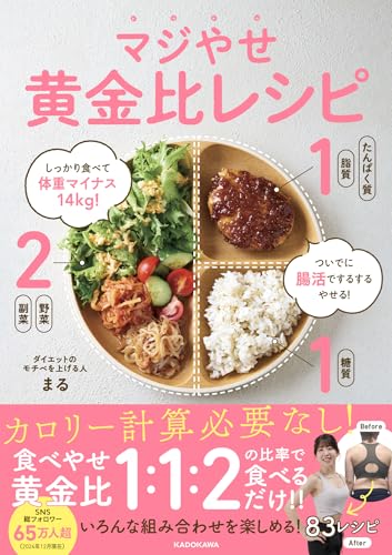 もりもり食べて、するするやせる!モチベ爆上がりのやせ黄金比レシピ集! ダイエットしたいと思っても、仕事や育児などで忙しい毎日を過ごす中、運動を習慣づけるのは至難の業。「ダイエットするからには本気出してやせる!」をモットーとする、ママダイエッターまるさんがそんな忙しい女子におすすめするのが、1:1:2のやせる黄金比の食事です。カロリー計算の必要もなく、盛り付けたときに、たんぱく質・脂質のおかずが1、糖質が1、野菜や汁物などの副菜が2の割合になっていればOK。カロリーを気にするダイエットでは体重は減っても、肌はカサカサ、体調も崩しがちですが、「まるレシピ」は腸活もできる美活メニュー。味のバリエーションも豊富な83レシピを紹介しています。お気に入りの1:1:2の組み合わせを見つけて、まずは1日1食を、1:1:2にするところから始めてみてください!