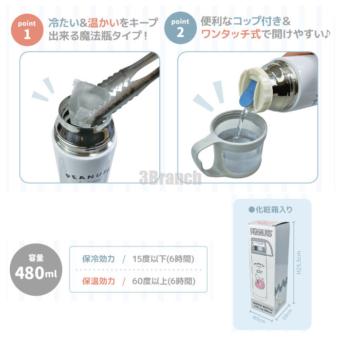 スヌーピー グッズ コップ付き ステンレス水筒 480ml 水筒 保冷 保温 レディース キッズ キャラクター ステンレスボトル SNOOPY PEANUTS