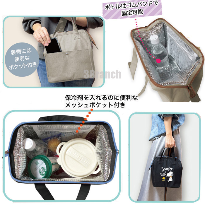 内側は保冷仕様になっており、お弁当やドリンクをしっかり保冷。