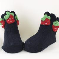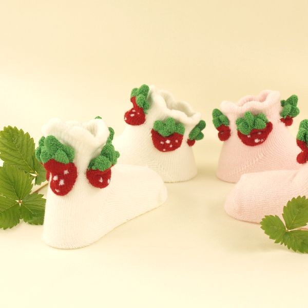 ご出産祝の贈り物に いちごのついたお子様用立体ソックス 特に女の子たちに人気です 新生児〜4歳まで